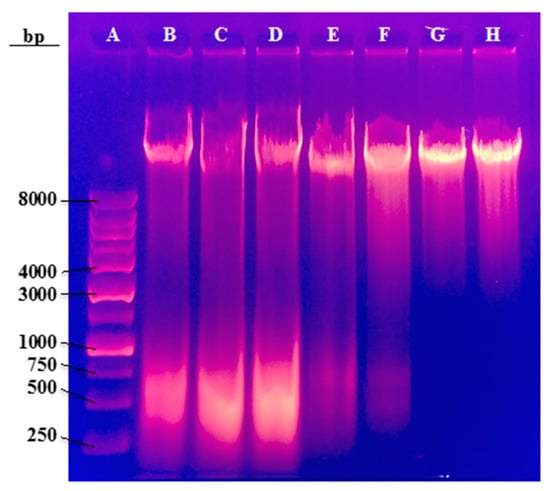 The samples of 0 to 15 µg/mL ZnO (Lanes B–D) have a prominent band smear towards low molecular weight around 500 base pairs. This band corresponds to RNA molecules that were also purified during DNA extraction. Lanes E and F (20 and 25 µg/mL ZnO) displayed the bands as well, but were in trace amounts that resulted in faint bands. The higher concentrations of 50 and 100 µg/mL of ZnO (lanes G and H) had no appearance of the RNA band. This indicates that with increased ZnO dosage, CHO-K1 cell’s RNA is destroyed. If RNA is no longer synthesized within the cell, then DNA replication cannot occur as well. When DNA replication is halted, the cell can no longer produce the necessary proteins for maintenance, survival, and the creation of a healthy internal environment. This explains why ZnO has such a direct effect on cell viability and morphology at the higher concentration doses.