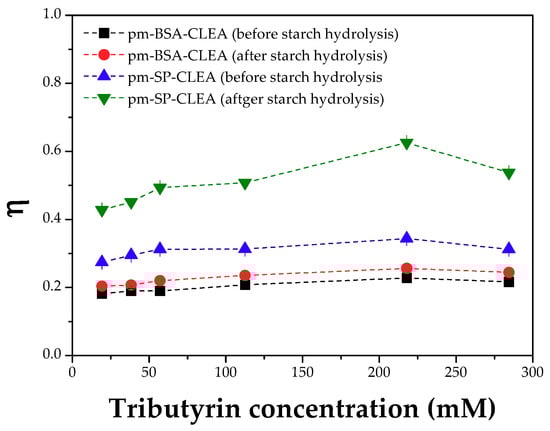 - Guauque Torres, M.P.; Foresti, M.L.; Ferreira, M.L. Effect of different parameters on the hydrolytic activity of cross-linked enzyme aggregates (CLEAs) of lipase from Thermomyces lanuginosa. Biochem. Eng. J. 2013, 72, 18–23. [Google Scholar] [CrossRef]