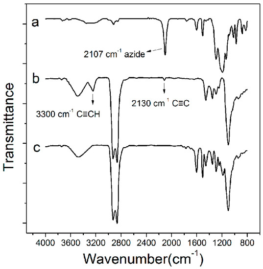 In addition, GIR spectra, as shown in Figure 2, also suggest that “click” chemistry was successfully applied to the hydroxyl/propargyl-terminated binary OEG-SAM. The GIR spectrum of N3-Ar-O-C9F17 (curve a) clearly reveals the appearance of an absorbance peak at 2107 cm−1, which is characteristic of the azide groups. The peaks at 1284, 1183, and 1135 cm−1 are attributed to C-F stretching vibrations [23] and peaks at 1600 and 1500 cm−1 are the characteristic stretching peaks of the C=C bond in the benzene ring [24]. The hydroxyl/propargyl-terminated binary OEG-SAM (curve b) shows characteristic peaks at 3300 and 2130 cm−1 (≡C-H and C≡C stretching) [25], 3500 cm−1 (-OH stretching), and 1103 cm−1 (C-O-C stretching) [24]. After the triazole formation with N3-Ar-O-C9F17, the peaks from the propargyl and azide groups disappeared and the characteristic C-F and benzene ring stretching peaks were observed on FS-SAM (curve c).