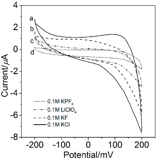 The electrochemical response of a thin film is strongly influenced by electrolyte properties, such as ion charge, size, and hydrophilicity/hydrophobicity. It is well known that SAMs formed on substrates are not perfectly uniform but may have some defects and allow some degree of penetration by solvent molecules and electrolyte ions. To obtain insight into the ion permeability of the FS-SAM, we used CV to study the film capacitance (C) (C gives rise to current during the charging of the electrode double layer and exhibits a direct correlation with supporting electrolyte) in different inert electrolytes without any redox species. Figure 3 shows the CV data of the FS-SAM-modified gold electrode between −200 and 200 mV in 0.1 M KCl (curve a), 0.1 M KF (curve b), 0.1 M LiClO4 (curve c), and KPF6 (curve d) at 50 mV/s. Table 1 exhibits the calculated film capacitances from the corresponding CV data according to the formula C = ic/2vA, where ic is the charging current (μA), v is the scan rate (mV/s), and A is the electrode area (cm2) [29].