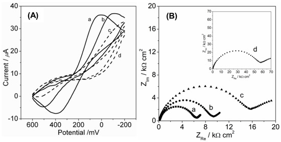 CV (A) and EIS (B) of 10 mM Ru(NH3)63+ in different electrolyte solutions on the binary OEG-SAM and the FS-SAM-modified gold electrodes: the binary OEG-SAM-modified gold electrodes in 0.1 M KCl (curve a) and 0.1 M KPF6 (curve b), and the FS-SAM-modified gold electrodes in 0.1 M KCl (curve c) and 0.1 M KPF6 (curve d). CV scan rate, 100 mV/s. pH: 7.0.