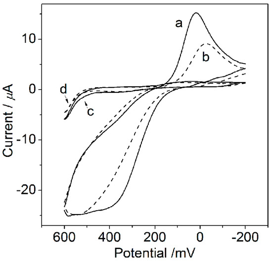 Cyclic voltammetry (CV) on the FS-SAM-modified gold electrode between −200 and 200 mV in different electrolyte solutions: 0.1 M KCl (curve a), 0.1 M KF (curve b), 0.1 M LiClO4 (curve c), and KPF6 (curve d). Scan rate, 50 mV/s. pH: 7.0.