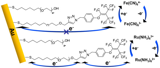 Interestingly, the expected blocking behavior for Fe(CN)63− on the FS-SAM was not observed for Ru(NH3)63+. The response of Ru(NH3)63+ on the FS-SAM, in fact, is less suppressed compared with that on the binary OEG-SAM. Fe(CN)63− (6 Å) and Ru(NH3)63+ (6.4 Å) have comparable sizes, we conclude, if the redox reaction of Ru(NH3)63+ is assumed to occur by access to the electrode surface through the pinhole defects present in the SAMs, the redox reaction of Fe(CN)63− should also exhibit facile kinetics. Given that this phenomenon was not observed, the Ru(NH3)63+ redox reaction does not occur by access of the redox species to the electrode surface but by electron tunneling through the bonds, as shown in Scheme 2. The FS molecule with an aliphatic chain length of 2.4 nm of the –CH2– and –CH2CH2O– units, provided through bond tunneling pathway [38]; and the delocalized π electrons, which are present in the aromatic ring, triazole, and alkene units, can bridge the redox species and the electrode surface effectively to facilitate the electron transfer. The redox reaction of Ru(NH3)63+ has been reported to follow the outer-sphere electron transfer mechanism [39,40]. In this case, physical contact between the redox species and the electrode surface is not essential for the electron transfer process since it is favored by the tunneling mechanism. In the case of the FS-SAM in this study, the aromatic and triazole rings with delocalized electrons facilitate the electron transfer of Ru(NH3)63+, and the aliphatic chains provided the bond tunneling pathway. In contrast, the redox reaction of Fe(CN)63− follows an inner-sphere electron transfer mechanism, where the access of redox species to the electrode surface is necessary for the electron transfer reaction to occur [40,41].