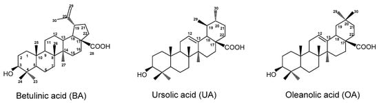 Among natural products of plant origin that are considered as abundant sources of lead structures for the discovery of new drugs, the pentacyclic lupane, ursane, and oleanane triterpenoids occupy a prominent place [1,2]. Triterpene acids (betulinic, ursolic, and oleanolic acids, Figure 1) are of interest for pharmacological research, as they exhibit a variety of biological activities including antimicrobial, antiparasitic, antitumor, and antiviral, in particular, anti-HIV, types of activity [3,4,5,6]. Among these properties of triterpenoids, of special interest is their anticancer activity and the ability to trigger the mitochondrial apoptosis pathway in various types of human cancer cells [5,6,7,8,9]. Thus, betulinic acid is capable of inducing apoptosis in tumor cells, such as melanoma, adenocarcinoma, neuroblastoma, medulloblastoma, glioblastoma and neuroectodermal tumors [7,8,9]. The in vivo anticancer activity of betulinic acid was identified using xenograft models [10,11]. The ursolic acid can also induce apoptosis, autophagy, and cell cycle arrest through various pathways, such as inhibition of DNA replication, stimulation of reactive oxygen species (ROS) production, and affecting the balance between proapoptotic and antiapoptotic proteins [6,12,13].