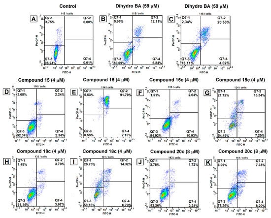 AnnexinV/7-AAD staining upon induction of apoptosis in Jurkat cells. Cells were treated with compounds at their IC50 concentration for 24 and 48 h. Then, the cells were harvested, stained with Annexin V/7-AAD and analyzed by flow cytometry. The experiments were performed three times, and the results of the representative experiments are shown. The first cytogram represents an untreated cell sample (A); after incubation with dihydrobetulinic acid for 24 h (B) and for 48 h (C); after incubation with compound 15 for 24 h (D) and for 48 h (E); after incubation with compound 15c for 24 h (F) and for 48 h (G); after incubation with compound 18c for 24 h (H) and for 48 h (I); after incubation with compound 20c for 24 h (J) and for 48 h (K). Q7-1, necrotic cells; Q7-2, late apoptotic cells; Q7-3, living cells; Q7-4, early apoptotic cells.