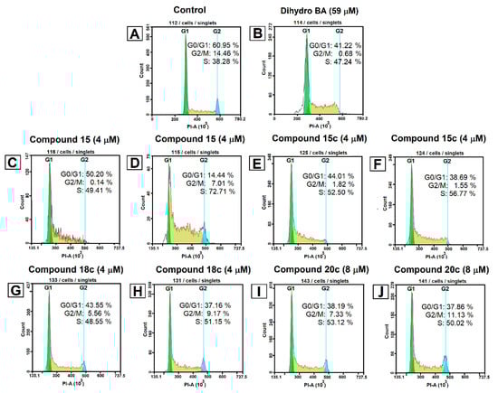 DNA flow cytometry was also used to analyze the cell cycle kinetics in Jurkat cells pre-incubated with dihydrobetulinic acid and derivatives 15, 15c, 18c, or 20c at their IC50 concentration for 24 and 48 h (Figure 3).