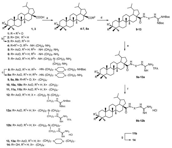 While synthesizing the target compounds, we found that the Boc-deprotection of guanidine derivatives of betulinic and betulonic acids in acid medium (50% TFA in CH2Cl2) is complicated by skeletal rearrangements of the lupane skeleton. It is known from the literature [41,42] that hydrogenation of the C-20 double bond of lupane triterpenoids does not considerably affect their cytotoxic activity and selectivity between normal and tumor cell lines; therefore, in the subsequent experiments, we used 20,29-dihydrobetulinic and 20,29-dihydrobetulonic acids 1 and 2 to prepare target compounds 9b–12b and 14 (Scheme 1).