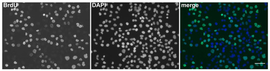 The detection of BrdU using DNase I and exonuclease III. Examples of microscopic images of cell nuclei labeled for 5 min with BrdU and fixed with formaldehyde. The DNA was labeled by DAPI. The scale bar—50 μm. Adapted with permission from Ligasová et al., 2017, Looking for ugly ducklings: The role of the stability of the BrdU-antibody complex and the improved method of the detection of DNA replication. PLoS ONE 12(3): e0174893 [47].