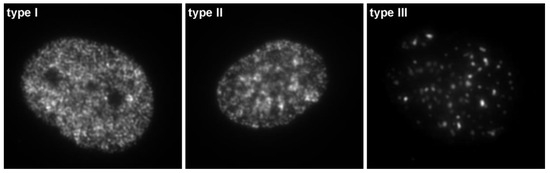 The approaches based on the immuno-detection of halogen derivatives are very important procedures used for the detection of the replicational activity of cells, and serve as an important tool for the description of cellular proliferation and cell cycle by microscopy or flow cytometry as well, e.g., [57,58,59,60,61,62,63]. They also enabled researchers to collect a new data about the organization of replication. In this respect, it was, for example, proven that during the S phase, three basic replication patterns can be observed (Figure 3), or if described in more detail, five patterns can be observed in mammalian cells [64,65,66].