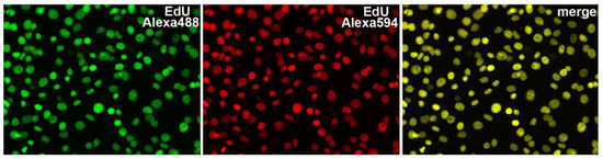 - Bradford, J.A.; Clarke, S.T. Dual-pulse labeling using 5-ethynyl-2′-deoxyuridine (EdU) and 5-bromo-2′-deoxyuridine (BrdU) in flow cytometry. Curr. Protoc. Cytom. 2011, 55, 7–38. [Google Scholar] [CrossRef]