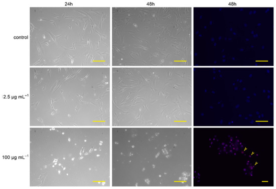 The human skin fibroblast cell morphology. The left column and the middle column show untreated control cells and cells stimulated with C. japonica callus extract at a final concentration of 12.5 and 100 µg mL−1 after 24 and 48 h of incubation, respectively. The right column shows cells stained with propidium iodide/Hoechst33342 after 48 h of incubation with C. japonica callus extract at a final concentration of 12.5 and 100 µg mL−1; yellow scale bar = 50 µm; yellow arrows indicate the dead cells stained with propidium iodide.