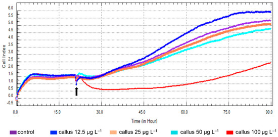 The real-time, label-free monitoring of the callus extracts effects of on CRTL-2522 human skin fibroblast proliferation using the xCELLigance system. A representative graph is shown. CRTL-2522 cells were treated with various concentrations of callus extract. The cell index value was monitored in real-time for 72 h (black arrow indicates the time of callus extract administration).