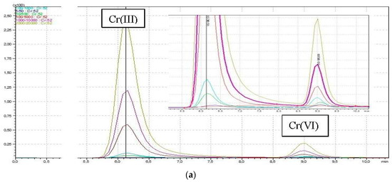 Because of their shorter retention times for chromium, the Bio WAX column was selected for testing real samples. The LOD values for Cr(III) were equal to 1.3 ng/g in solid sample and 2.6 ng/L in solution, and for Cr(VI), 0.7 ng/g in solid sample and 1.4 ng/L in solution. However, in order to avoid tailing the peak connected with the higher concentration of Cr(III) in toys, higher concentrations of mix standard solutions containing: 10,000 ng/L Cr(III) and 1000 ng/L Cr(VI) were prepared and analyzed. In order to maintain high concentrations of Cr(III), high concentrations of Cr(VI) were also maintained, therefore peak resolution was satisfied.