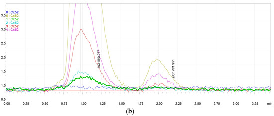 A series of standard solutions containing 5, 10, 20, 50, and 100 ng/L Cr(VI), and 10 times higher concentrations of Cr(III) were prepared. The Cr species were completely resolved on anion exchange Hamilton PRPX-100 250 mm × 4.1 mm (10 µm) column with retention times of 6.1 min for Cr(III) and 9.1 min for Cr(VI). Because of the column length and extended retention time, a different Bio WAX nonporous 50 mm × 4.6 mm (5 µm) column was used. The Cr species were completely resolved with retention times of 0.97 min for Cr(III) and 1.98 min for Cr(VI). For both methods, good separation of standard solutions and of Cr(III) and Cr(VI) was obtained. Figure 1a,b presents the overlaid chromatograms for HPLC-ICP-MS.