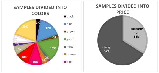 Toys were collected randomly from several convenience shops in urban areas in Poznań (Poland). These were shops commonly visited by people, which offer different types of toys at various prices. The samples were segregated into parts with different colors (black 3%, blue 17%, brown 2%, green 18%, metal 2%, orange 4%, pink 10%, red 10%, transparent 6%, violet 2%, white 6%, and yellow 20%). In addition, to answer the question of whether more expensive toys are safer for the health of our children, a comparative analysis of the content of chromium in toys divided into cheap toys <5 € (34%) and expensive >5 € (66%) was made. The division is presented on Figure 2.