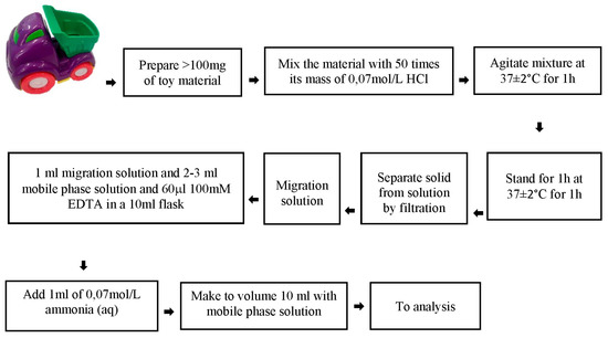 The procedure used HPLC-ICP-MS and followed EN71-3, which simulated gastric digestion as would occur in the case when a child swallows toy material; this is presented in Figure 3.