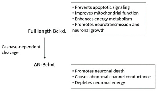 In contrast to its protective role, Bcl-xL is also responsible for causing neuronal death during neurotoxic challenge. Bcl-xL undergoes caspase 3-dependent N-terminal cleavage forming ∆N-Bcl-xL (Figure 1) [65]. Loss of CA1 hippocampal neurons after cerebral ischemia is highly associated with the accumulation of ∆N-Bcl-xL in vivo [18,66,67]. Additionally, excitotoxicity, the major neuronal death signal during cerebral stroke caused by a surge of glutamate, leads to an abundance of ∆N-Bcl-xL in primary neurons in vitro [68]. Approaches that inactivate ∆N-Bcl-xL or prevent the accumulation of ∆N-Bcl-xL using cleavage resistant animal models, delivering pharmacological inhibitors, and applying ischemic preconditioning protect neurons by improving mitochondrial function against neurotoxic stimuli [18,66,67,68,69,70].