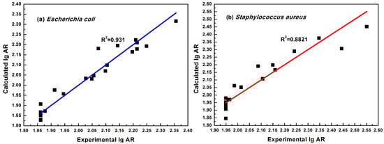 Experimental versus calculated values according to the optimal models. (a) is for best model against E. coli, (b) is the for model against S. aureus.