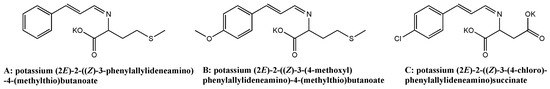 Compound A: potassium (2E)-2-((Z)-3-phenylallylideneamino)-4-(methylthio)butanoate; Yield: 43.34%; m.p. 287.2 °C; FTIR(cm−1): 1578, ν(C=O, C=N, C=C), 753,ν(CAr=H), 694,ν(CAr=H); 1H-NMR: δH (400 MHz, MeOD) 7.96 (1 H, -CH=N, t, J 7.0), 7.46 (2 H, Ph-H, dd, J 11.2, 4.2), 7.27 (2 H, Ph-H, dd, J 5.9, 1.5), 7.06–6.99 (1 H, CH=C, m), 6.86 (1 H, C=CH, dd, J 16.0, 8.9), 3.78 (1 H, CH-N-, dd, J 8.8, 4.7), 2.50–2.37 (2 H, -CH2, m), 2.17–2.10 (1 H, -CH2, m), 2.03–1.99 (1 H, -CH2, m), 1.98 (3 H, -CH3, s); 13C NMR (101 MHz, MeOD) δ179.33(-COOK), 165.86(-CH=N), 144.49(-C=C), 130.55(Ph-C), 129.99(Ph-C), 129.44(Ph-C), 128.54(Ph-C), 128.24(C=C-), 76.25(-CH-N), 34.72(-CH2), 31.93(-CH2), 15.33(-CH3). MS (ESI) m/z calcd. for C14H16KNO2S 301.0, found [M + H]+ 301.6.