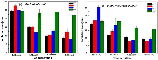 The diameter of the inhibition zone of new compounds was used to reflect the antibacterial activity, and ciprofloxacin (Cix) was used as the standard. The average and the standard deviation of the inhibition zones of the three compounds are shown in Figure 5. As shown in Figure 5a, the three screened compounds exhibited excellent antibacterial activity. The diameter of the inhibition zones of compounds A, B, and C was 24.33, 27.67, and 24.67 mm, respectively, at 0.25 mol/L, which was slightly higher than that of the drug ciprofloxacin (Cix: 24.33 mm) against E. coli. An obvious decrease in the diameter of the inhibition zone for the screened compounds was observed as the test concentration was decreased. Even at the minimal tested concentration of 0.03 mol/L, the screened compounds still exhibited good antibacterial activity. Similar inhibition of the screened compounds was observed for S. aureus, as shown in Figure 5b. A comparison of Figure 5a,b, reveals that S. aureus was more resistant to the screened compounds than E. coli, and the screened compounds possessed comparable antibacterial activity to ciprofloxacin against E. coli and S. aureus.