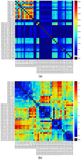 Comparison of the number of peptide binders with repertoire dissimilarity index (RDI) values of class II HLA molecules. (a) Heatmap of the number of peptide binders shared by HLA molecules; (b) heatmap of the RDI values between HLA molecules.