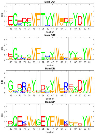 - Sidney, J.; Steen, A.; Moore, C.; Ngo, S.; Chung, J.; Peters, B.; Sette, A. Divergent motifs but overlapping binding repertoires of six HLA-DQ molecules frequently expressed in the worldwide human population. J. Immunol. 2010, 185, 4189–4198. [Google Scholar] [CrossRef] [PubMed]