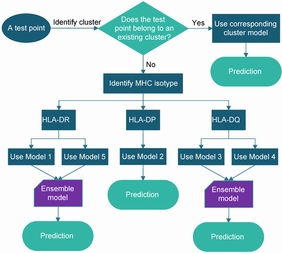 - Otherwise, identify the MHC isotype of the test point. The base learners Model 1 and Model 5 associated with the main DR and diverse clusters respectively were combined to make a prediction for the test point from the HLA-DR isotype. Since about 66% of data points associated with the diverse cluster in the training set were from the HLA-DR isotype, Model 1 was combined with Model 5 to perform the prediction. The base learner Model 2 associated with the main DP cluster was applied to perform prediction for the test point from HLA-DP isotype. The base learners Model 3 and Model 4 associated with the main DQ1 and main DQ2 clusters, respectively, were combined to perform prediction for the test point from the HLA-DQ isotype.