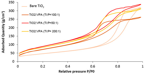 Figure 1 shows the nitrogen adsorption-desorption isotherms for the bare TiO2 and some samples (TiO2)x(VPA) (x = 50, 100, 200) desorbed at 100 °C for 6 h. All displayed type IV(a) isotherms with an H2(b)-type hysteresis loop (according to IUPAC terminology) [15], typical for mesoporous materials with complex pore-networks. Data showed a slight increase of the specific surface area up to 269–333 m2/g for hybrid samples and that these latter exhibited larger final saturation plateau than bare TiO2, suggesting higher inter-particle interactions and extra-mesoporosity.