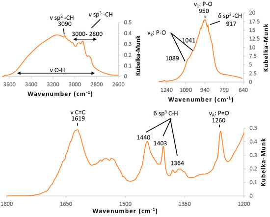 All FT-IR spectra exhibited strong absorption bands ascribed to Ti-O and O-H bonds below 800 cm−1, around 1620 cm−1 and above 2800 cm−1, (Figure S2), however, the concentrations of VPA were too small to display clear absorption bands assigned to O–P–O group between 1200 and 950 cm−1. Only a weak band at 1260 cm−1 was related to P=O bond. Phosphonate and C=C bonds were evidenced by DRIFT experiments under argon at 150 °C since spectra displayed strong adsorption bands at around 1000 cm−1 (symmetrical and unsymmetrical stretching band of O–P–O) and weak ones at 1260 cm−1 (νP=O), and 1619 cm−1 (νC=C). (Figure 2) Absorption bands in the range of 3000–2800 cm−1 (C-H bending) and 1500–1350 cm−1 (C-H stretching) could be explained by the presence of residual alcohol molecules at the surface.