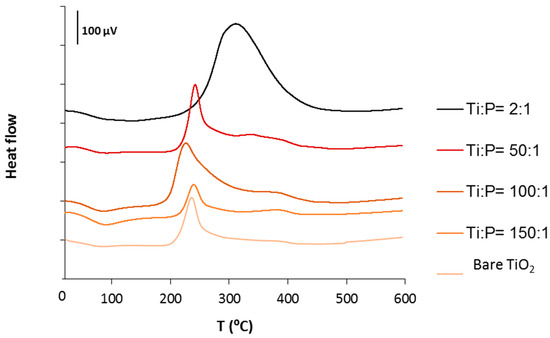 TDA of bare and some hybrid TiO2 samples (samples Ti/P = 25; 75, 125 and 200 are omitted for clarity).