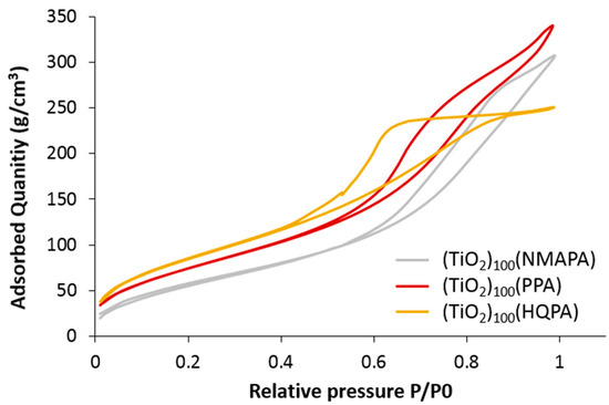 Nitrogen adsorption-desorption isotherms of (TiO2)100(PPA), (TiO2)100(NMAPA), (TiO2)100(HQPA).