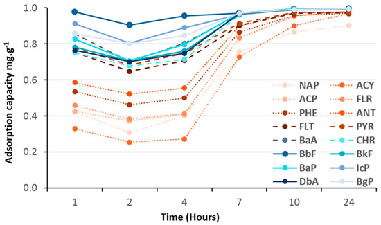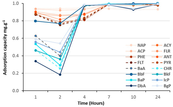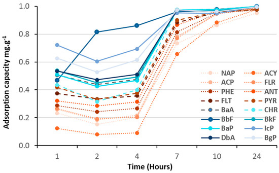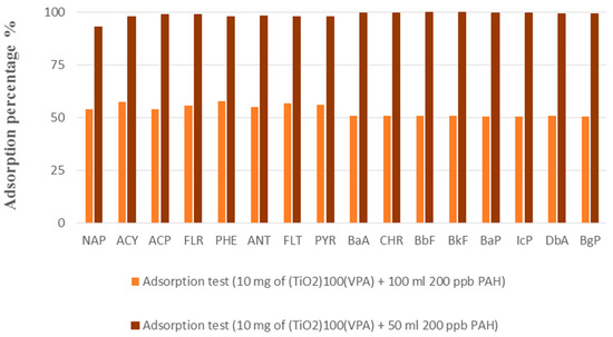Batch absorption tests using 10 mg of (TiO2)100(VPA) and 50 mL of 200 ppb PAH aqueous solution for 24 h at 20 °C and at pH 6.5, showed that the 16 PAH molecules were extracted with efficiencies of 93–100% leading to a high total equilibrium adsorption capacity of around 16–17 mg·g−1 (or around 1 mg·g−1 of each PAH). This was confirmed by doubling the volume of PAH aqueous solution, using 100 mL batches of 200 ppb PAH solution with 10 mg of the materials, whereupon the adsorption percentage was half that of the previous tests (Figure 6).
