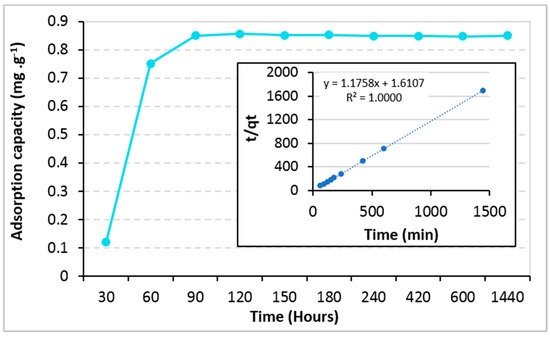 Adsorption capacity of (TiO2)100(VPA) toward benzo(a)pyrene as a function of time. Insert: Pseudo-second model for benzo(a)pyrene adsorption kinetics.