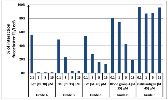 F1 was immobilized on a DNA chip, thanks to its DNA sequence. The distance between two F1 on the surface was estimated to be nearly 50 nm [35]. Therefore, the lectin LecB can only bind to one F1 glycocluster at the time. The binding of immobilized F1 to LecB was competed with each of the 156 glycans at four different concentrations (0.1, 1.0, 5.0 and 15 µM). For each glycan and each concentration, the alexa 647-LecB fluorescent signal was recorded and averaged over 16 spots, leading to four-point competition histograms (Figure 2 and Figure S2). 100% signal (see Figure 2) corresponded to the fluorescent signal measured with a reference assay under which no competition could occur. Glycans able to compete with F1 to bind LecB lead to a decrease of the fluorescent signal. Therefore, for a given glycan concentration, strong binding glycans lead to stronger decrease of the fluorescent signal so to lower percentages. Accordingly, tested glycans were classified qualitatively into 5 groups (A, B, C, D and E) depending to their ability to reduce the measured fluorescent signal at the four different concentrations (Figure 2 and Table 1). Grade A are stronger competitor than grade B which are stronger than grade C, and so on. A Grade A was given for oligosaccharides that were able to reduce 80 to 40% of the fluorescent signal at a concentration of 0.1 µM and to reduce it by more than 90% at concentrations of 1, 5 and 15 µM. Grade B indicated a decrease of fluorescence by 70% to 90% at 1 µM and more than 90% at 5 and 15 µM. Grade C corresponded to a decrease of 50 to 70% for 1 µM, around 80% for 5 µM and more than 90% at 15 µM. D indicated a decrease of less than 50% for 1 µM and 80% at 5 and 15 µM. When no inhibition was observed for the four concentrations tested, the grade was E.