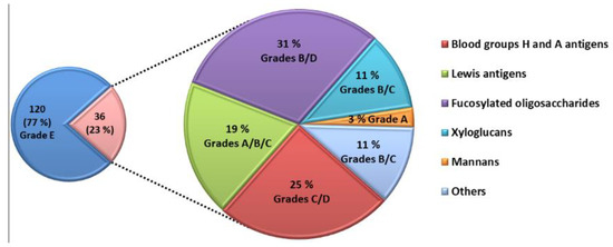 The competitive assay was able to identify 36 natural glycans interacting with LecB (Figure 3). The majority of these glycans belong to the families of A and H blood group antigens, Lewis antigens and fucosylated glycans. They were produced by bacterial fermentation. Five glycans interacting with LecB are extracted from biomass such as xyloglucans and mannans.