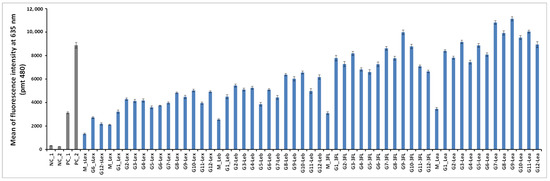 For the latest parameter, the topology of oligoglycoclusters was varied using different carbohydrate-centered scaffolds (i.e. pentofuranose: Arabinose, xylose, ribose; hexapyranose: Glucose, galactose, and mannose). Two negative controls, NC_1 and NC_2, corresponded respectively to a single oligonucleotide immobilized through an amide bond and a d-galactocluster immobilized by DDI. Both negative controls exhibited a very low alexa 647 fluorescent signal (below 350 a.u.), illustrating the very low non-specific adsorption of LecB on the surface and its specificity towards fucose moieties. Two positive controls, PC_1 and PC_2, corresponding to a monofucoside (PC_1) and a mannose-centered tetravalent fucoside (PC_2) were used. (Figure 7). Oligoglycocluster immobilization deviated by less than 18%.