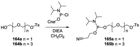 Synthesis of tosyl di- and tetra-ethyleneglycyl (2-cyanoethyl) N,N-diisopropyl phosphoramidites 165a–b. Cne: 2-cyano-ethyl.
