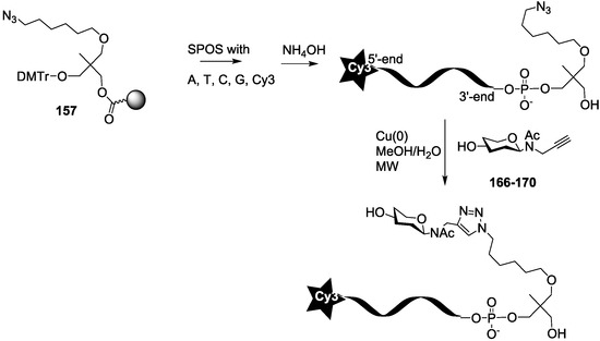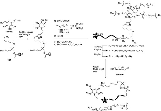 The synthesis of the polyazide scaffold oligonucleotide conjugates was performed on a solid support allowing their efficient, automated and rapid synthesis at about 200 to 300 nmol scale. Finally, the conjugation with the five oligosaccharides 166–170 was performed in solution allowing a divergent strategy, since only 20 nmol of scaffold were used for each. Thus, the synthesis required six steps (Scheme 3 and Scheme 4). Firstly, polyhydroxylated scaffolds (2–7) were immobilized on the azide solid support 157 by CuAAC. Secondly, each free hydroxyl was phosphorylated with tosyl-di- or tetra-ethylene glycol phosphoramidites (165a–b). Thirdly, the DNA sequence was elongated and labelled with Cy3 fluorescent dye. Fourthly, tosyl groups were substituted by azide using tetramethylguanidine azide. Finally, an ammonia treatment afforded the Cy3-oligonucleotides bearing a tri- or tetra-azidolinker scaffold. After HPLC purification on a C18 reverse-phase column, each construction was aliquoted to 20 nmol. The final CuAAC was carried out on a 20 nmol scale with the different N-acetyl-propargyl oligosaccharides 166–170 affording the expected oligosaccharide cluster-Cy3-oligonucleotide conjugates G1–G12.