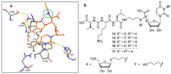(a) Insights into the X-ray co-crystal structure of MraY from Aquifex aeolicus in complex with muraymycin D2 9 (PDB 5CKR) [46,47]: protein-inhibitor interactions at the nucleoside binding site and its close proximity (hydrocarbon scaffold of inhibitor 9 in orange, green circle highlights 6′-N). (b) Target structures 13–16 of this study with previously reported muraymycin analogue 17 [34].
