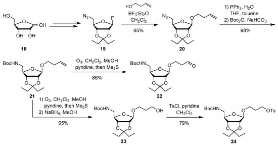For the synthesis of aminoribosylated target compounds 13 and 15, suitably protected aminoribose-containing building blocks were required. Starting from d-ribose 18, we therefore prepared anomerically pure 2,3-pentylidene-protected 5-azido-5-deoxy-β-ribosyl fluoride 19 according to established procedures (Scheme 2) [49,50,51,52]. With 19 as a glycosyl donor and homoallylic alcohol as acceptor, riboside 20 was obtained in 65% yield. The pronounced β-selectivity resulted from steric shielding of the α-face [49,50]. A sequence of Staudinger reduction of the azide and Boc protection then afforded butenyl riboside 21 in 98% yield.