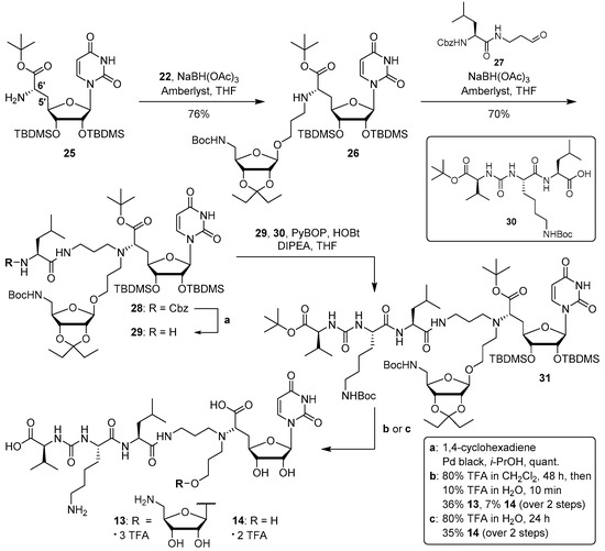 For the synthesis of target compound 13, we started the construction of the muraymycin scaffold from the diastereomerically pure, protected (6′S)-5′-deoxy nucleosyl amino acid 25, which had been prepared from uridine according to previously reported protocols [35,36]. A reductive amination reaction of aldehyde 22 with uridine derivative 25 gave the N-alkylated product 26 in 76% yield (Scheme 3). Another reductive amination of 26 with l-leucine-derived aldehyde 27 (which had been prepared as described before [20]) then furnished tertiary amine 28 in 70% yield. Remarkably, the order of the two reductive aminations (first with 22, then with 27) was crucial. Attempts to reverse the order, i.e., to perform the reductive amination with aldehyde 27 first, resulted in a failure of the second reductive amination reaction. We speculate that this might be owed to increased steric hindrance of the 6′-amino group in the latter case.
