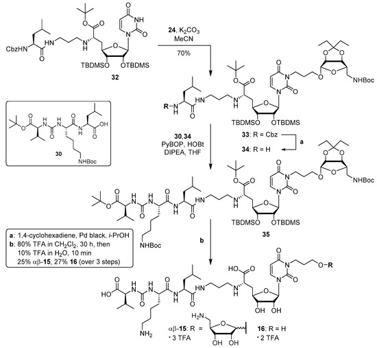 For the synthesis of target compound 15, we employed the previously reported protected 5′-deoxy muraymycin building block 32 [36] as starting material. Selective alkylation of 32 with tosylate 24 at the uracil-N-3-position was achieved in 70% yield (product 33, Scheme 4). The position of the newly introduced aminoribosyl-linker unit was unambigously proven by 2D NMR spectroscopy. The pronounced regioselectivity of this reaction (uracil-N-3 vs. 6′-amino group) was probably owed to the significant steric shielding of the electronically more nucleophilic 6′-amino functionality.