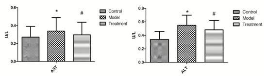 Compared with those in the control group, the ALT and AST levels increased significantly in the model group and decreased significantly in the treatment group (Figure 1).