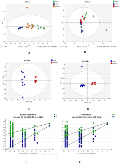 PCA score plot obtained using positive and negative ion mode datasets of the three groups (A,B) and the model and treatment groups (C,D). The corresponding permutation test (n = 200) of the model and control groups (E,F). (A, C, and E represent ESI+, and B, D, and F represent ESI-).