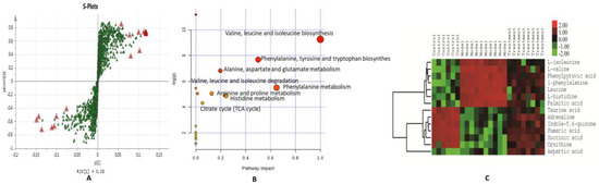 The S-plot obtained using positive and negative ion mode datasets of the control and model groups (A). Metabolomic pathway analysis overview indicating selected metabolic pathways that were significantly affected among the control, model, and treatment groups. The size of each node indicates the pathway impact (based on the impact of each identified metabolite in a given pathway). The node color is graded depending on its p-value from pathway enrichment analysis (B). We used logarithmic analysis to produce the heat map, showing the 14 significantly altered metabolites based on ANOVA (C). Color from green to red represents the intensity of these metabolites from low to high levels in the analysis.
