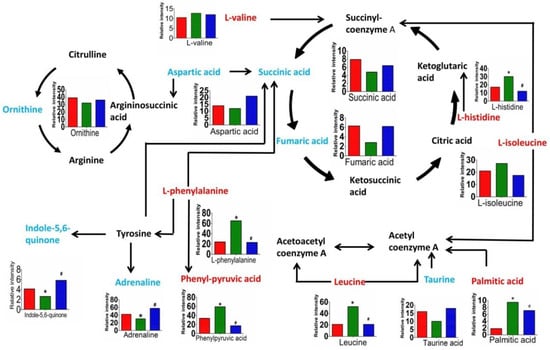 The potential metabolites shown in Table 2 are involved in various metabolic pathways. We investigated the links between these metabolites using the KEGG database and HMDB and generated a metabolic map (Figure 4). The map suggested that INH/RFP and SSP had an important influence on the energy metabolism of mice. To further evaluate the effect of pre-administration of SSP on the potential biomarkers, one-way ANOVA with Tukey’s post hoc test was performed between the three groups by SPSS software. The relative peak intensity of the 14 metabolites is shown in Figure 4. Compared with those in the model group, nine metabolites including taurine, L-isoleucine, aspartic acid, ornithine, indole-5,6-quinone, succinic acid, adrenaline, palmitic acid, and L-histidine were significantly recovered in the treatment group. The other five metabolites were also reversed in the model group compared with the control group.