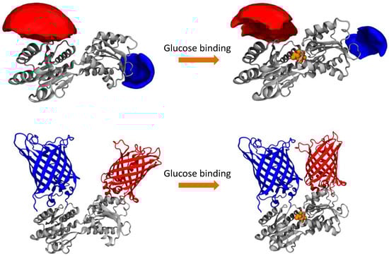 (upper panels) Illustration of chosen dye labeling positions to design a FRET-based glucose sensor: 3D structures of ligand-free (left structure; 2FW0) and ligand-bound MglB (right structure; 2FVY) shown together with calculated AVs for donor (blue volumes, attached at position 137) and acceptor (red volumes, attached at position 42) dyes. Note the conformational change of the MglB structure induced by glucose (orange spheres) binding. (lower panels) For comparison, an equivalent illustration of both MglB structures is shown with donor FPs (blue, inserted at position 12) and acceptor FPs (red, inserted at the C-terminus). The relative orientations of the FPs are arbitrary and not based on experimental measures.