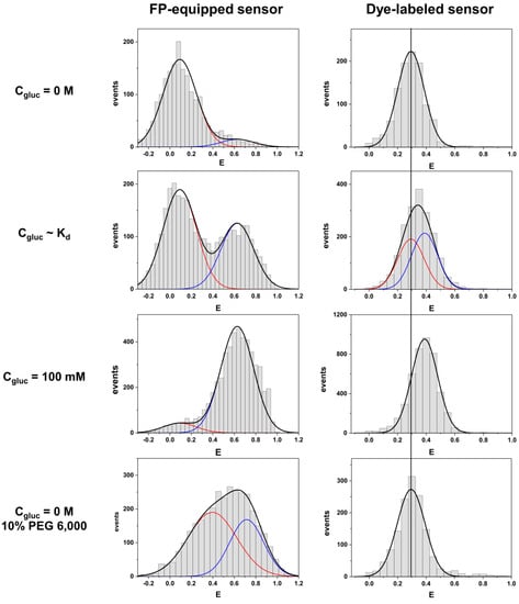 Another clear difference between the sensors with different fluorophores is given by their response to crowding conditions. We incubated both types of sensors in the ligand-free state (i.e., 0 M glucose) in a buffer solution enriched by a high concentration of polyethylene glycol with a molecular mass of 6000 Dalton (PEG 6000). PEG polymers are often used as synthetic crowding agents to mimic cellular crowding []. As we pointed out in an earlier publication [], FP-equipped sensor constructs experience a pronounced structural compaction upon crowding. This causes a shift of all populations towards larger energy transfer efficiencies in the smFRET histogram (Figure 2). In addition, a partial depopulation of the low FRET population and a concurrent additional population of the high FRET state takes place also in the absence of glucose. In contrast, the dye-equipped species is not sensing any compaction by the crowding agent. The obtained smFRET histogram remained almost unchanged as compared to the pure buffer condition.