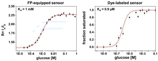 Our comparison of two FRET-based glucose sensors reveals that the signal change of the FP-equipped sensor outperforms that of the dye-labeled analog. The attachment positions of the fluorophores on the surface of the glucose binding protein MglB vary for both sensors because both are optimized to reach a large signal change upon glucose binding. However, the choice of a sensor type may consider other aspects depending on the application of the sensor. The dye-labeled sensor may be beneficial if a high affinity is desired. Yet, the major advantage of the dye-labeled sensor is its insensitivity towards crowding. Thus, the application of dye-equipped sensors in living cells is a possible alternative using microinjection [], although this procedure is rather time-consuming. It can be likewise beneficial to use FP-equipped sensors for in vitro applications because of their large signal changes [,].