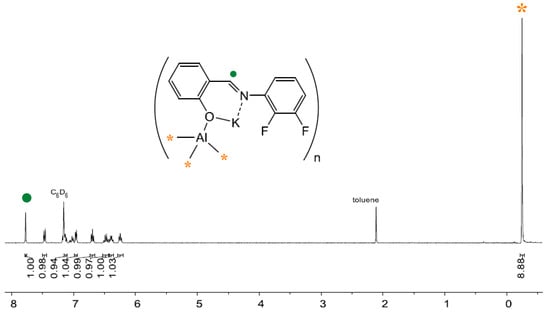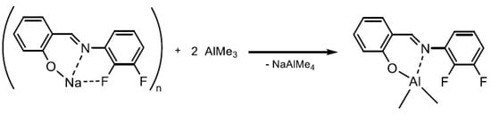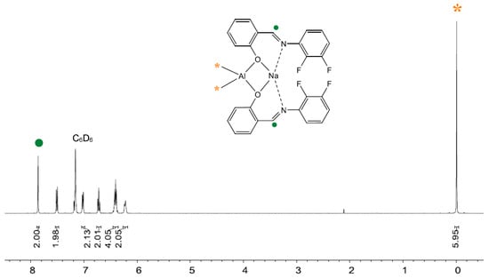 However, for compound 2, in the NMR different behaviour was observed (Figure 4). In this case, once the crystals of 2 were dissolved, the 1H NMR spectrum in benzene-d6 did not reveal the expected resonances for the characterized aluminate in the solid state. The signal of the methyl groups bound to the aluminium centre appeared at δ−0.01 ppm, a remarkable shift compared with the lithium aluminate; moreover, this signal is consistent with three hydrogen atoms per ligand in agreement with a [NaAlMe2(La)2] (3) formulation (Scheme 2), a disposition already described in our previous work for the phenoxo-imino species with donor substituents [44]. In fact, for those species without the fluorine substituents, it was not possible to isolate the analogous sodium derivate, as it evolves very rapidly into the formation of compounds with the [NaAlMe2L2] formulation, via a rearrangement process that also might generate [NaAlMe4], as shown in Scheme 2. In this case, the presence of the Na···F interactions seems to stabilize the structure and it was possible to isolate [NaAlMe3La] in the solid state.